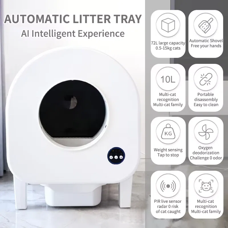 This Intelligent Automatic Cat Litter Box is crafted from durable PP plastic and designed with a 72L large inner space, giving your cat a comfortable and hygienic toilet solution. The round shape and modern design make it suitable for cats of all sizes and perfect for any indoor environment.