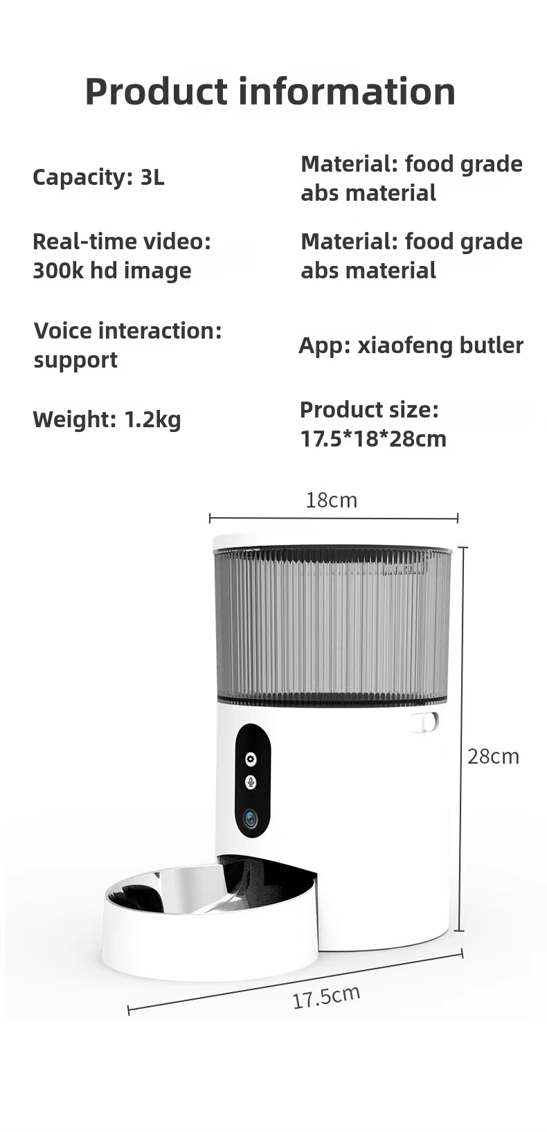 Measuring 28 × 17.5 × 18 cm and weighing only 1.5 kg, the Smart Automatic Pet Feeder is portable and practical. With USB charging power and US plug compatibility, it offers convenience and safety for daily use. Perfect for modern households, this feeder combines technology, reliability, and style to support smarter pet care.